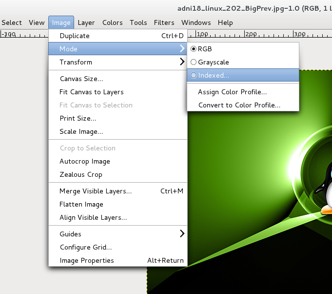Step Two : GRUB doesn’t support images with more than 14 colors in an image. So we need to reduce the above image to 14 colors so that we can use it in GRUB. To do that, open the image with GIMP. Go to Image menu > Mode > Indexed.