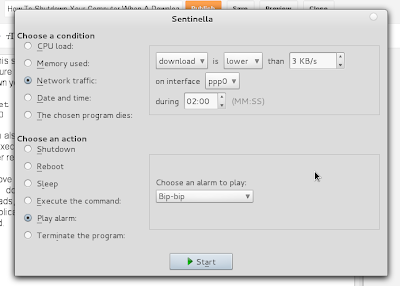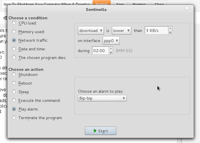 To shutdown your PC after a download (torrent or direct) is done, click on Network Traffic, select download is lower than 3KBps, or a speed you prefer on the interface you use to connect the internet during a specified period of time (say 5 minutes) and select the action “Shutdown”. Don’t forget to save your settings by clicking the start button. The application will hide itself in the notifications tray and will monitor the system activity. The moment download gets lower than the speed you specified for specified number of minutes (indicating end of download), it will shut the system down. Note that this app can be used for more actions, not just shutting down your PC at end of download, I leave it to you to discover more.